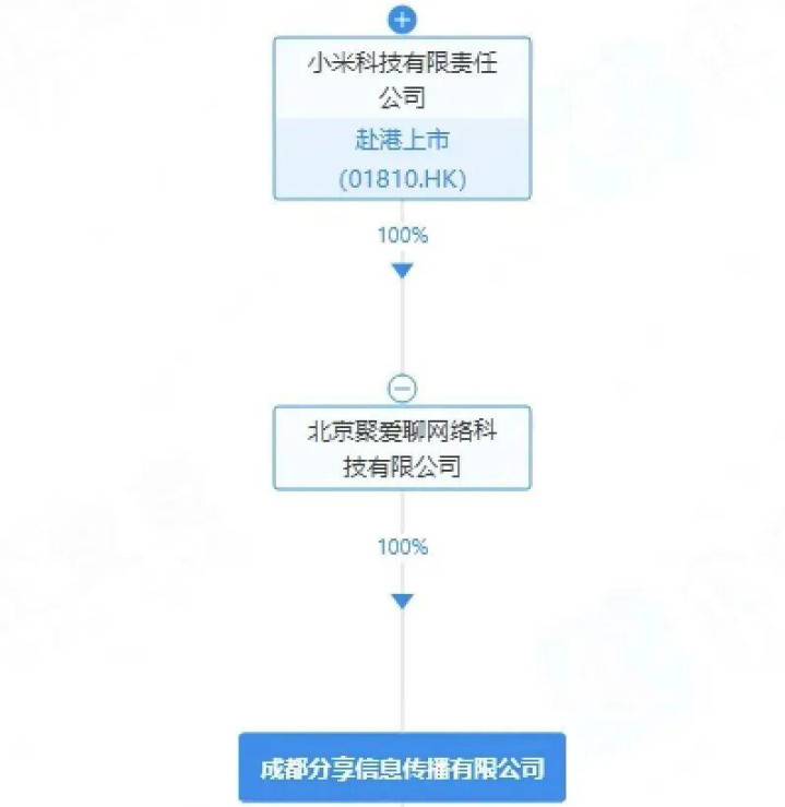 据应用商城页面显示,围观短剧APP归属于成都分享信息传播有限公司,其注册资本为1000万元,法定代表人王川为小米科技联合创始人、高级副总裁。经股权穿透可见,该公司由北京聚爱聊网络科技有限公司100%持股,后者则由小米科技有限责任公司全资持有。